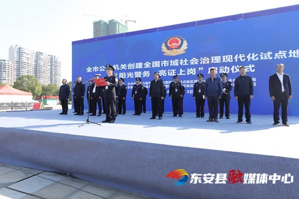 新湖南客户端11月13日讯(通讯员 唐常 肖申军)11月13日上午,永州市公安机关以视频连线方式同步举行创建全国市域社会治理现代化试点地区“阳光警务·亮证上岗”启动仪式,主会场设东安县,其他11个区县分别设分会场。市政府副市长、市公安局长车丽华在主会场出席仪式并讲话,市政府副秘书长、市信访局局长许金善主持,东安县委书记、二级巡视员冯德校,市委副秘书长、二级巡视员蔡建军,市政法委副书记、市创建全国市域社会治理现代化试点地区领导小组办公室主任王俊斌在主会场参加仪式。